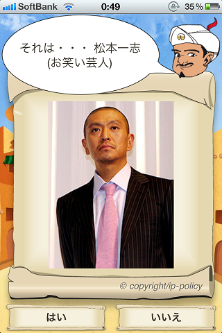どんなアプリかと言うと、魔人から出される質問に対して答えていくと、自分が頭に浮かべた有名人、有名キャラクターを当ててくれるアプリです。